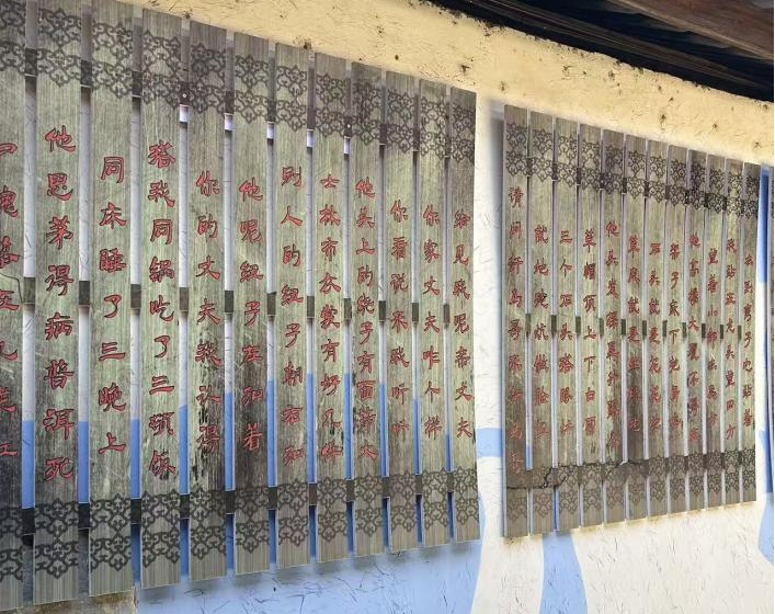 图为云南驿马帮博物馆 马帮哭嫁歌歌词雕刻