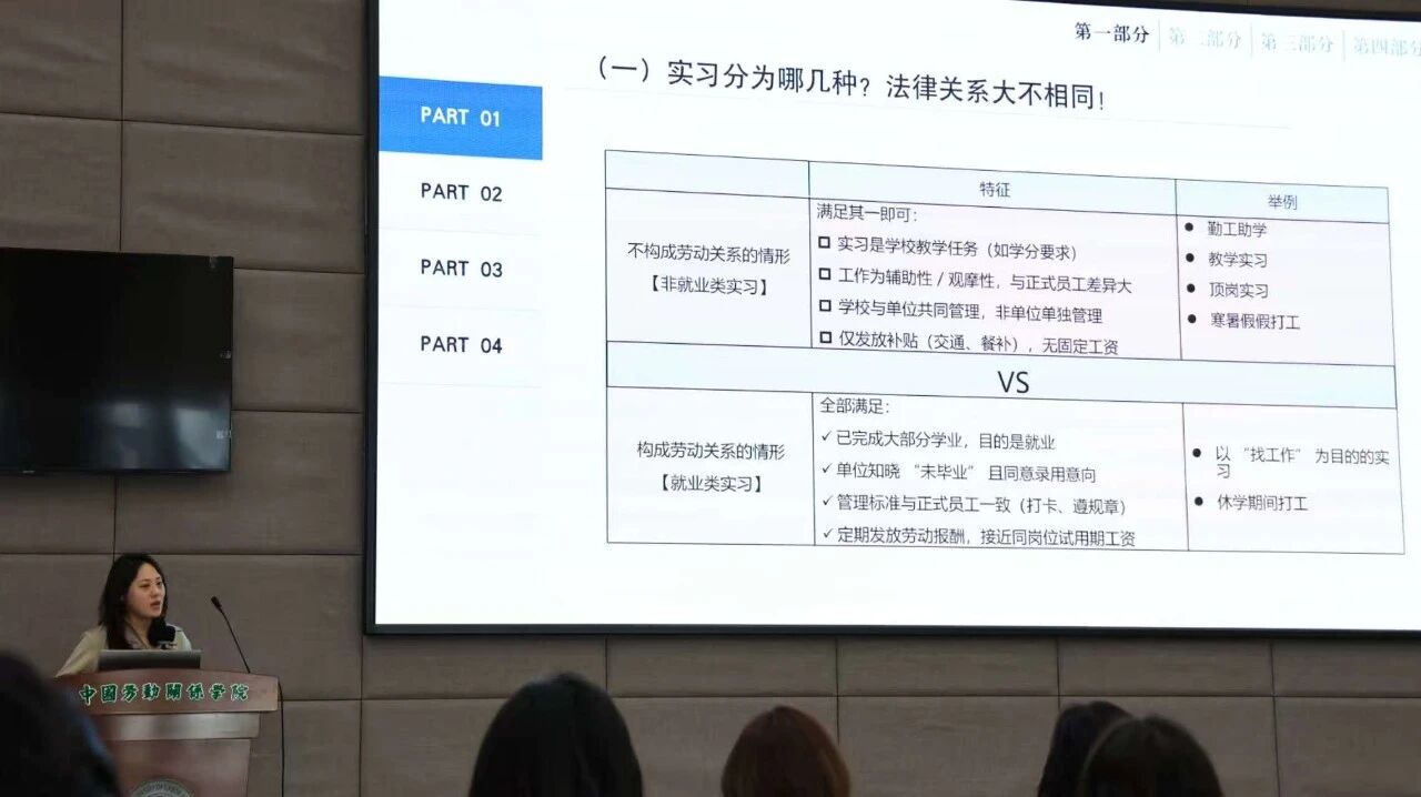 孙博文律师围绕实习权益保障与主播与MCN机构法律关系两大主题展开讲解。在实习权益方面,孙律师以是否构成劳动关系为标准,对实习类型进行了分类解读。他重点分析了非就业类实习生在加班时长、劳动报酬、人身损害赔偿、社保缴纳等方面的权益保障规则,并针对在校学生及兼职人群,就实习协议签订、争议风险规避提出了具体建议。