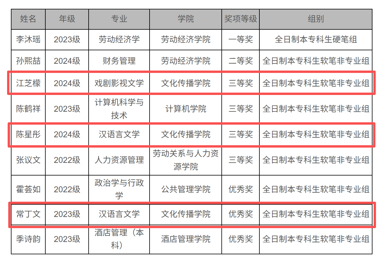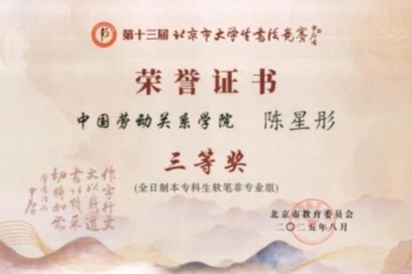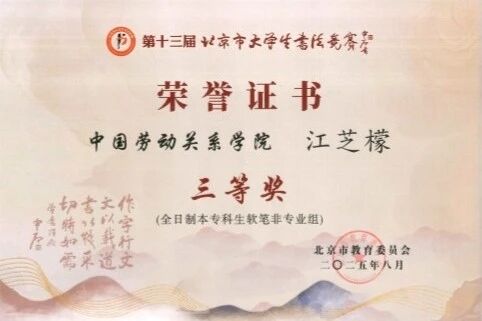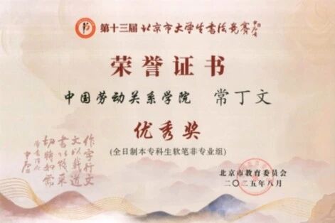 近日,第十三届北京市大学生书法大赛结果揭晓,中国劳动关系学院学子凭借扎实功底与出色表现,斩获多项个人奖项。其中,文化传播学院2024级戏剧影视文学专业学生江芝檬、文化传播学院2024级汉语言文学专业学生陈星彤获软笔非专业组三等奖,文化传播学院2023级学生常丁文获该组优秀奖。