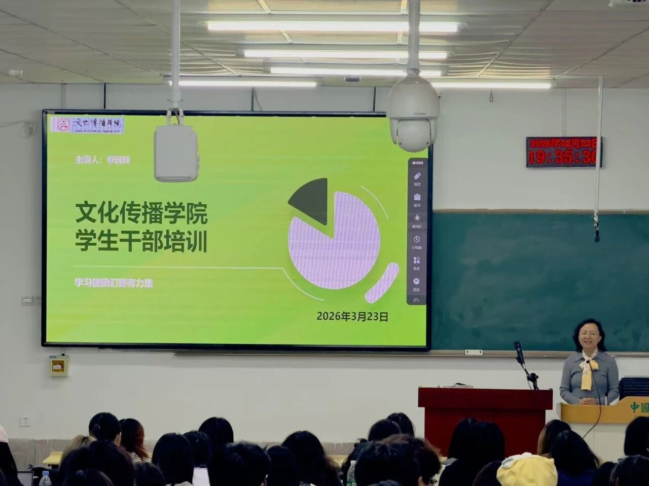 为进一步加强学院学生干部队伍建设,推动学风持续向好,文化传播学院于2026年3月23日晚19:30在涿州校区阶梯教室三召开学生干部大会。文化传播学院党总支书记李淑玲老师、2024级辅导员李璐老师出席会议,24、25级全体学生干部参会。