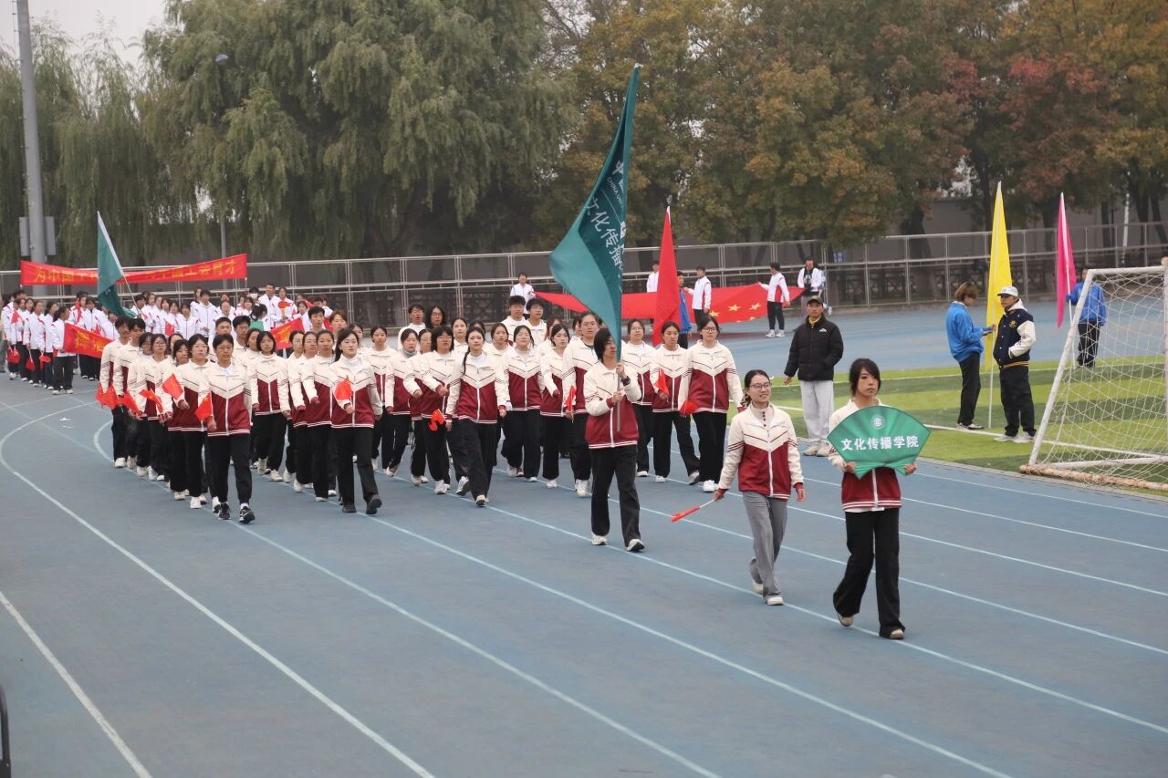 文化传播学院的方阵代表队入场。伴随着响彻云霄的口号,他们手持国旗,步伐有力,朝气蓬勃,意气风发,彰显着文化传播学院昂扬向上,同心协力的精神风貌。