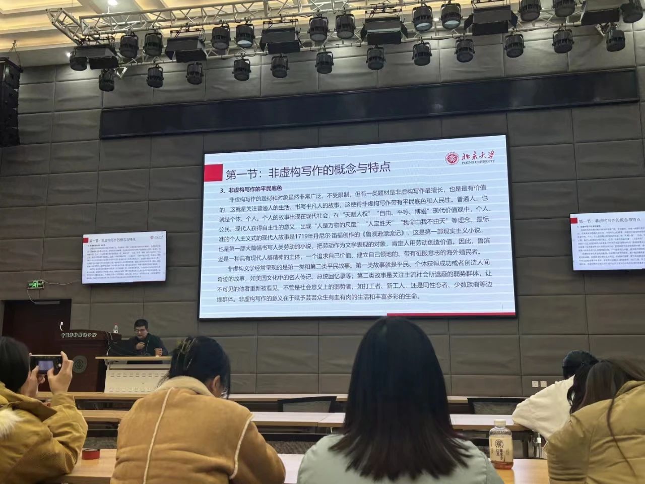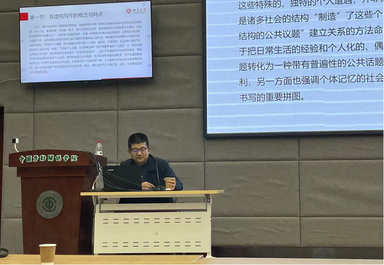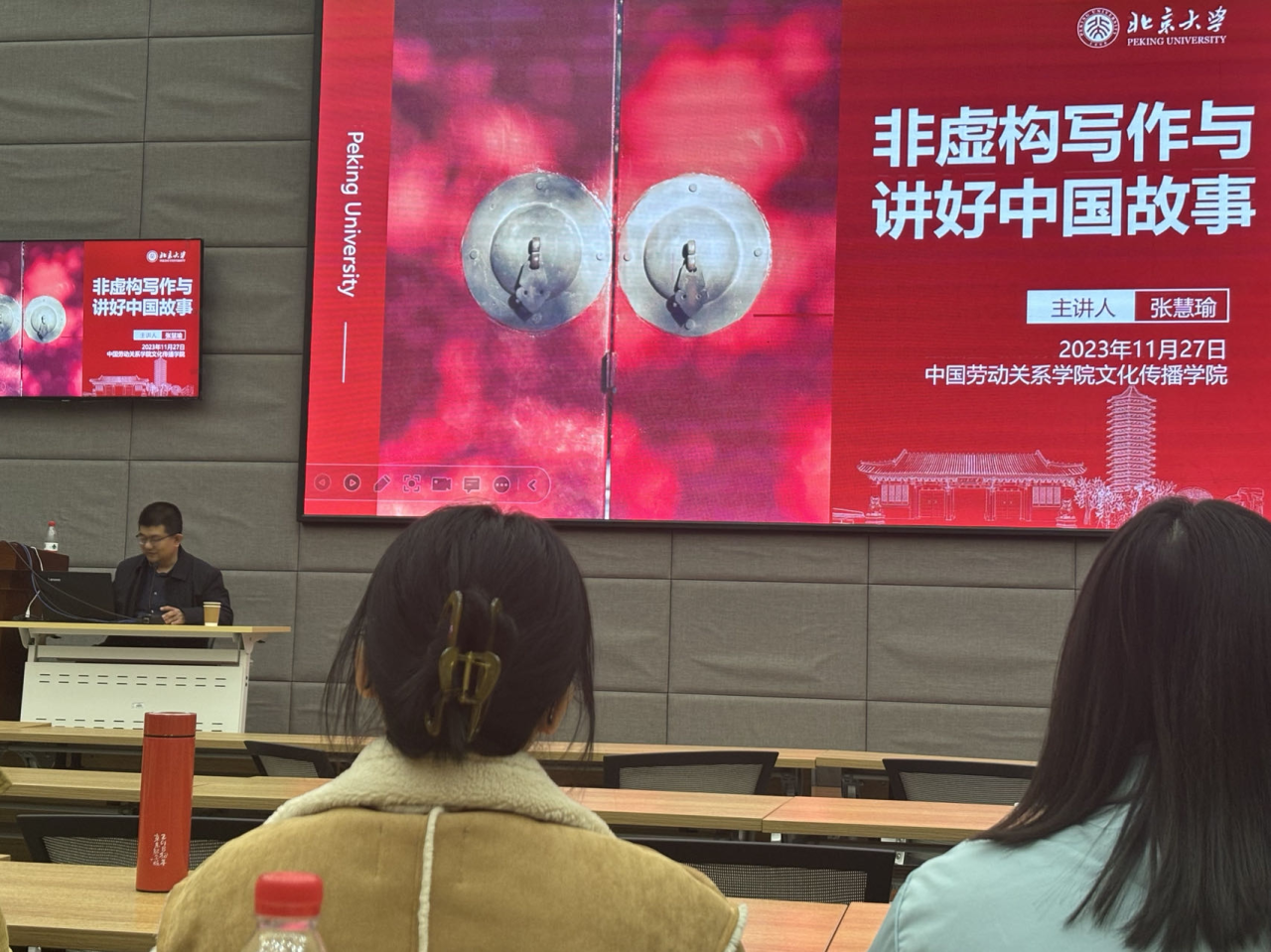 11月27日19:00,由中国劳动关系学院研究生处主办、文化传播学院承办的研究生培养质量提升强化月系列活动、增光传媒前沿论坛——第三场在北京校区致远楼909举行。本次讲座题为《非虚构写作与讲好中国故事》,由北京大学新闻与传播学院张慧瑜老师主讲,文化传播学院王翠艳老师主持。