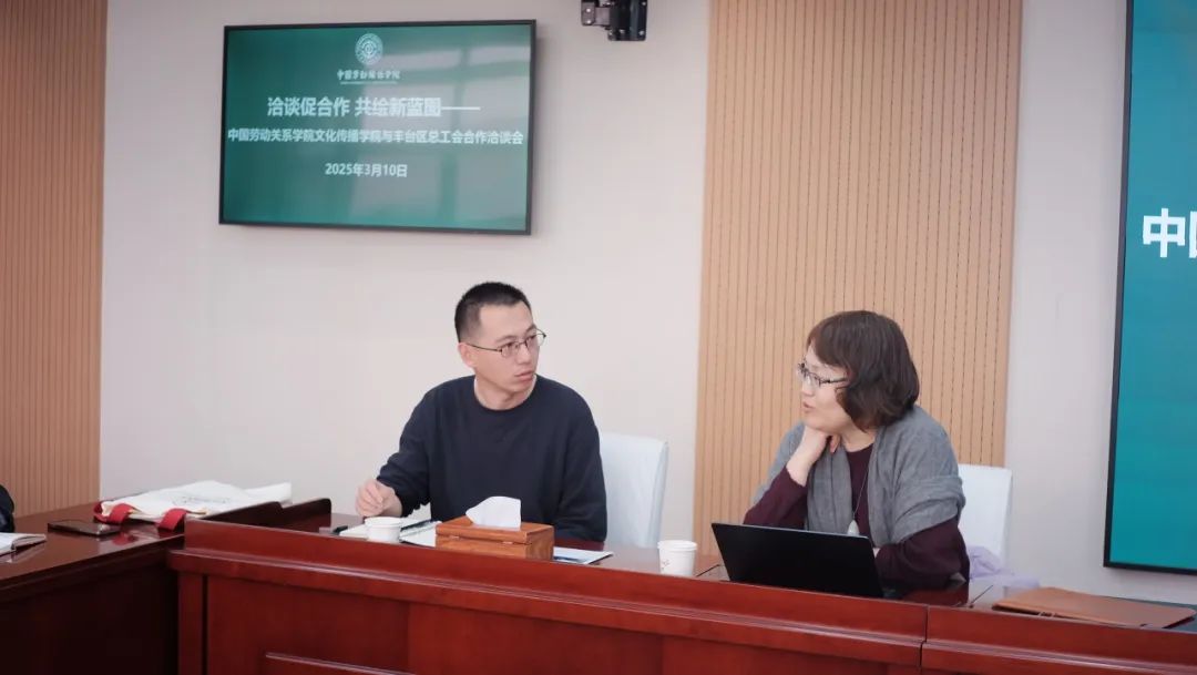 2025年3月10日,中国劳动关系学院文化传播学院与丰台区总工会合作洽谈会于致远楼509顺利举行。丰台区总工会组织人事部门有关人员一行到我院开展合作洽谈,文化传播学院院长王翠艳、党总支副书记张乃佳及部分老师参与会议。