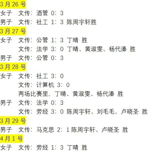 本届乒乓球比赛于3月26日顺利开幕。经过选拔,文化传播学院派出由男子选手陈周宇轩、刘毛毛、卢晓圣,女子选手丁晴、黄淑雯、蒋妍、杨代溱、张心仪组成的两支代表团参赛。