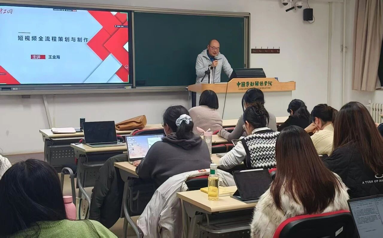 2025年12月18日晚,中国劳动关系学院文化传播学院主办的增光传媒前沿论坛专题讲座,以“线上+线下”结合的形式在北京校区闻道楼409室及腾讯会议平台同步举行。本次讲座以“短视频的全流程策划和制作”为题,由工人日报社编委及经济部主任、高级编辑王金海老师主讲,文化传播学院院长王翠艳老师主持,学院教师代表、全体在校研究生参加。讲座还吸引了复旦大学、中国科学院大学等外校师生云参与。