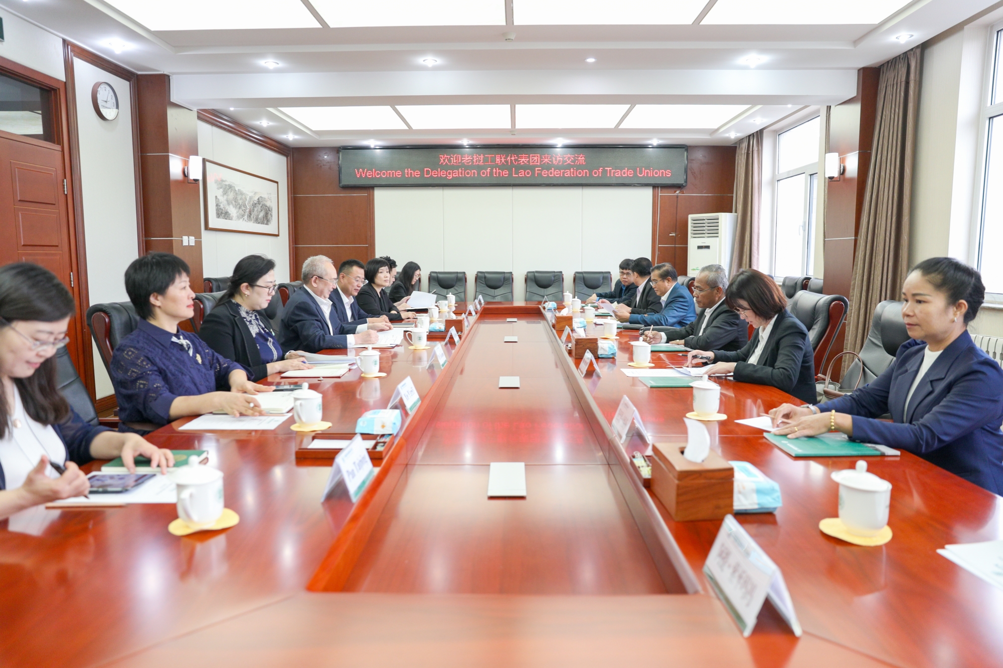 傅德印代表学校对列·赛亚鹏一行的到来表示热烈欢迎。他提到,一周前,老挝人民革命党中央总书记、国家主席通伦来华出席2025年上海合作组织峰会,并参加纪念中国人民抗日战争暨世界反法西斯战争胜利80周年活动,充分彰显了中老两国之间紧密无间的联系与深厚情谊。他回顾了学校与老挝工联多年交流合作奠定的深厚友谊,介绍了学校作为全总直属高校的历史沿革、办学特色,以及在学科建设、人才培养、工会干部培训、理论研究等方面的发展成果。他表示,期待未来与老挝工联进一步深化在工会干部培训、劳动关系、区域国别研究等领域的务实合作,共同推动中老工会事业发展,增进两国劳动者福祉,为全球工会事业注入新活力。