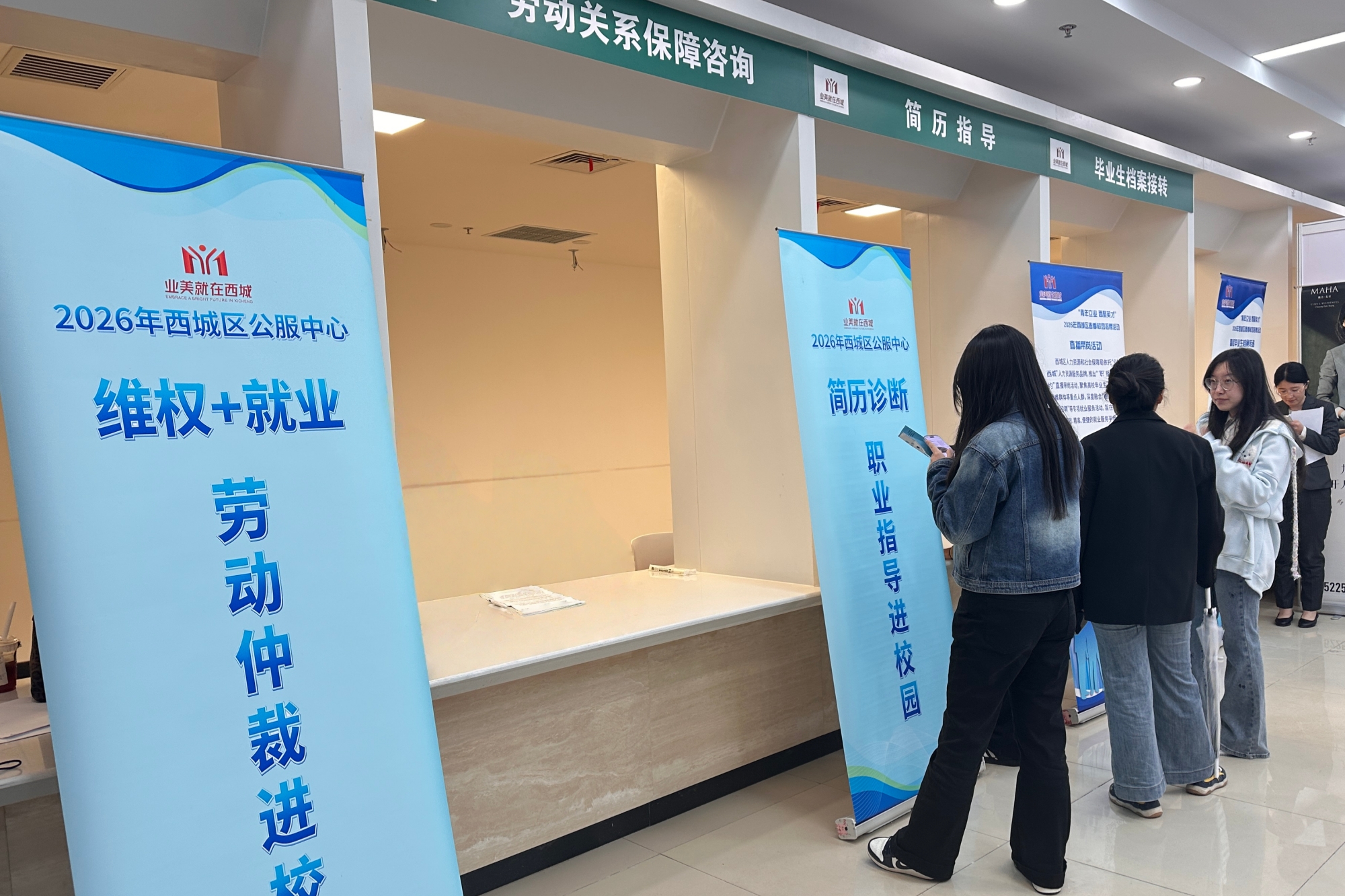 西城区人力资源和社会保障局积极组织企业参会,并在双选会现场设立服务专区,围绕劳动关系保障、简历指导、毕业生档案接转等就业重点事项提供咨询服务,为毕业生顺利进入职场提供多维度支持。同时,同步开展直播带岗活动,面向线上参会学生推介企业情况和岗位信息。