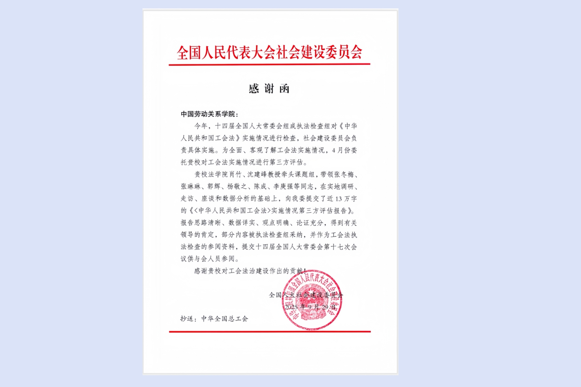 全国人大社会委来函感谢我校承担《工会法》实施情况第三方评估工作 - 中国劳动关系学院新闻网