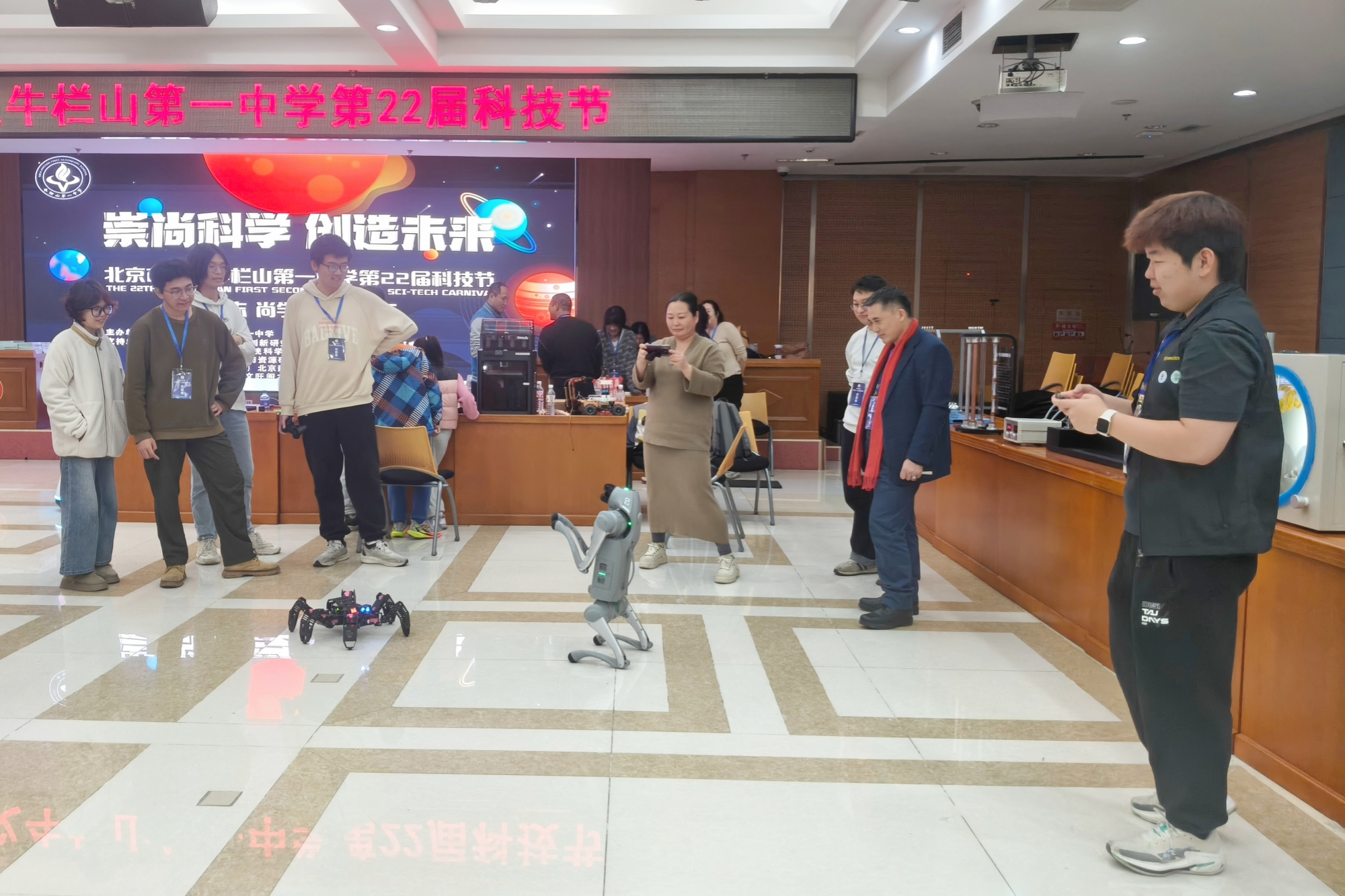 活动中,我校科普团队向牛栏山一中的师生们展示了多项前沿科技成果,包括磁性智能材料、磁控4D打印平台、磁控液滴、4D打印软体机器人抓手、磁控增强3D打印技术等创新项目。此外,团队还携带了灵活机动的蛇形机器人和宇树科技的智能机器狗,现场演示引起师生浓厚兴趣。