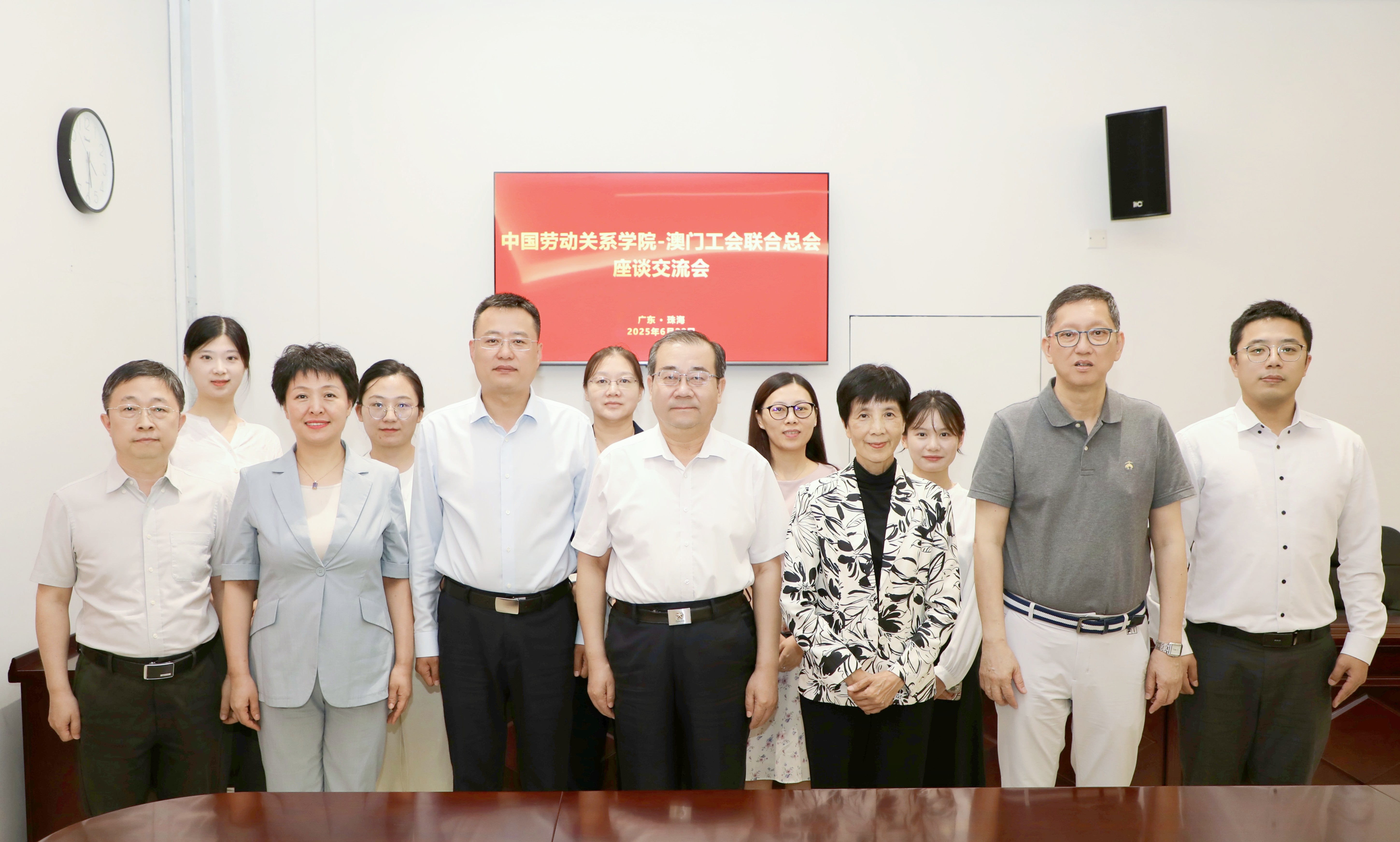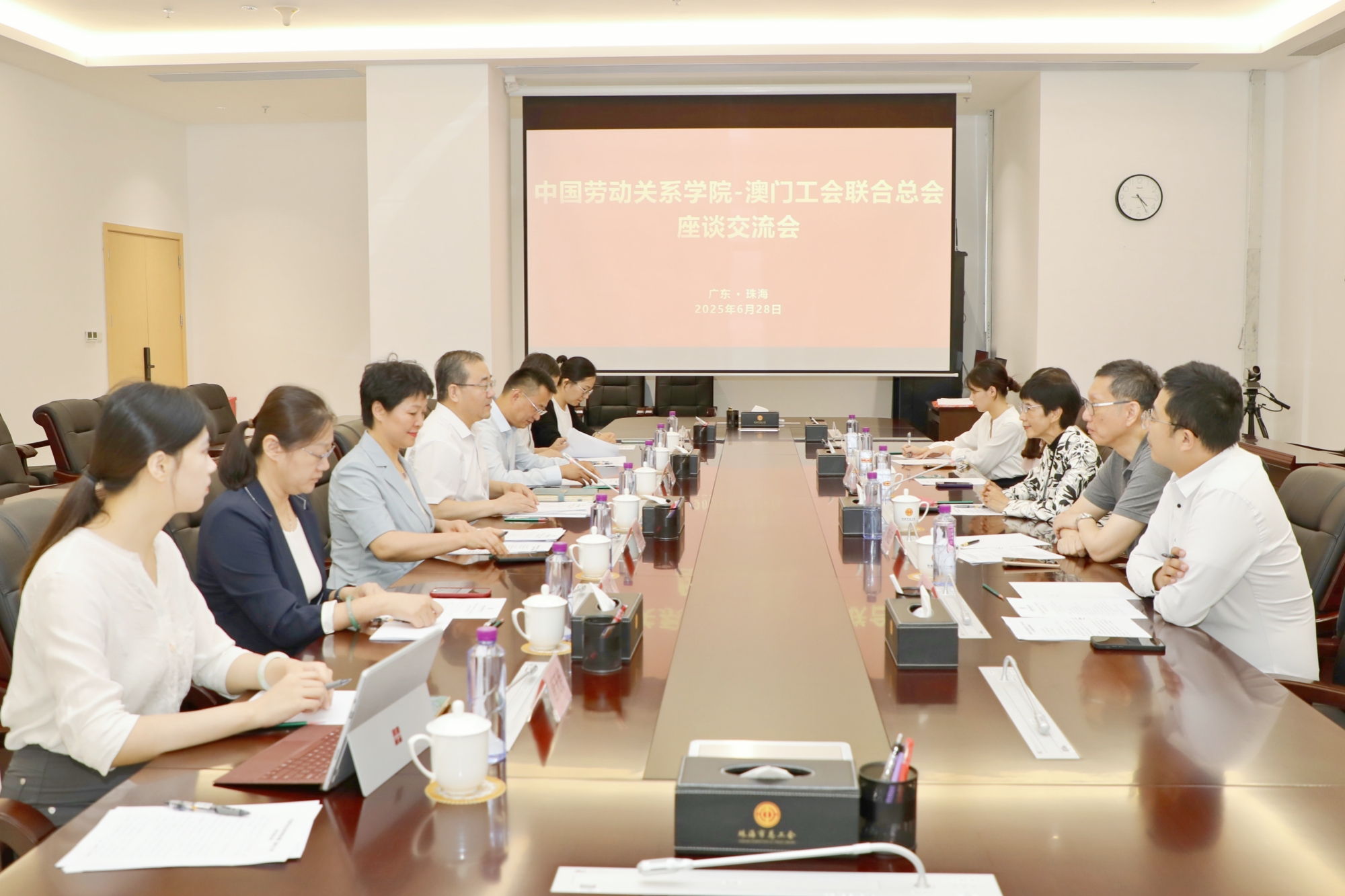 On the afternoon of June 28, Liu Xiangbing, Secretary of the Party Committee of China University of Labor Relations (CULR), met with the delegation of the Macao Federation of Trade Unions (MFTU) at Zhuhai Workers' Cultural Palace and held a friendly symposium. Ho Sut Heng, President of MFTU, and Lee Chong Cheng, Chairman of the Board of Directors, attended the symposium. Li Ke, Vice President of China University of Labor Relations (CULR) and member of the Standing Committee of the Party Committee, also attended, together with leaders from the Guangdong Office and Amateur Continuing Study Centre of MFTU, as well as from CULR's Office of Hong Kong, Macao and Taiwan Affairs, Scientific Research Department, Institute of Labor Relations and Trade Unions, and Graduate School. The symposium was chaired by Li Ke.