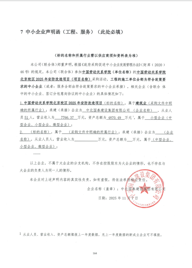 | 1 | 中北国泰建设集团有限公司 | 中国劳动关系学院北京校区2025年安防改造项目 | 中国劳动关系学院北京校区2025年安防改造项目位于北京市海淀区增光路45号,主要包括:将致远楼首层消防控制室内的设备移至大学生公寓首层消防控制室,并敷设管线等施工内容,以及工程量清单和图纸、竞争性磋商文件所示全部内容。 | 35日历天 | 刘健勇 | 一级建造师 注册编号:京1112006200806797 |