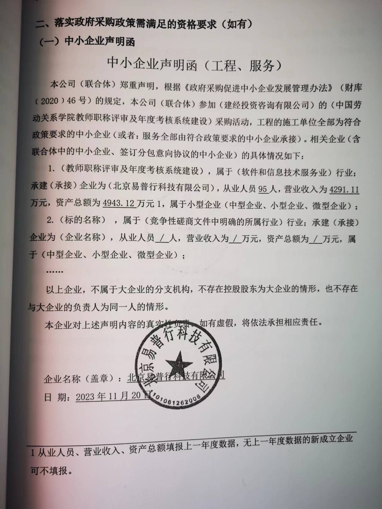 | 1 | 北京易普行科技有限公司 | 中国劳动关系学院教师职称评审及年度考核系统建设 | 建设职称评审和年度考核模块 | 实现职称评审和教师年度绩效考核人事基本信息及业绩数据的自动填报 | 合同签订后6个月内完成系统开放建设并验收合格 | 见磋商文件 |