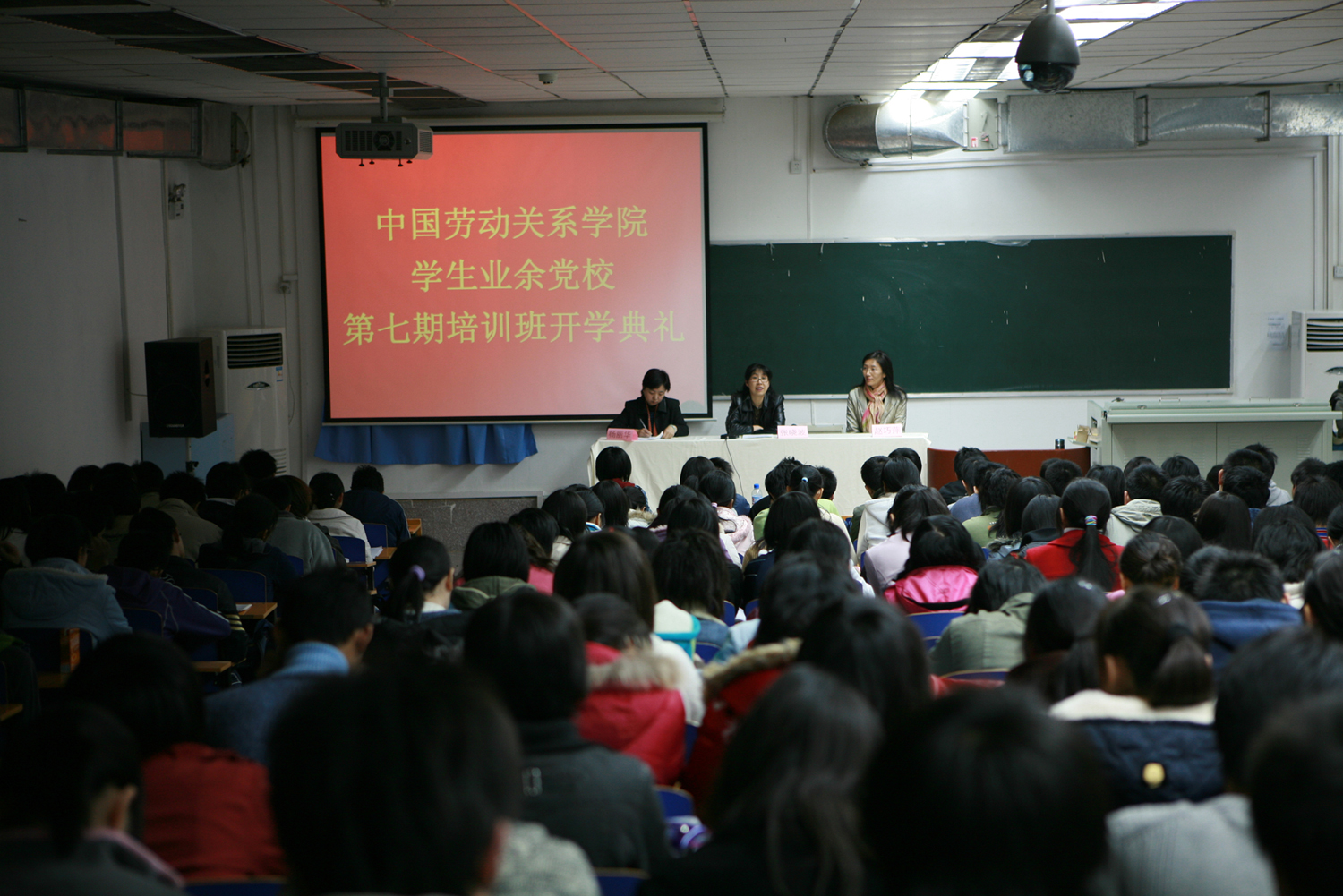 2007年11月13日晚,学院党委举办的中国劳动关系学院学生业余党校第七期培训班开学典礼在涿州校区举办。学院党委组宣部、学生工作部的领导、各系院党总支书记和辅导员以及来自全院1200多名希望加入中国共产党的同学分别在六个阶梯教室参加了开学典礼。