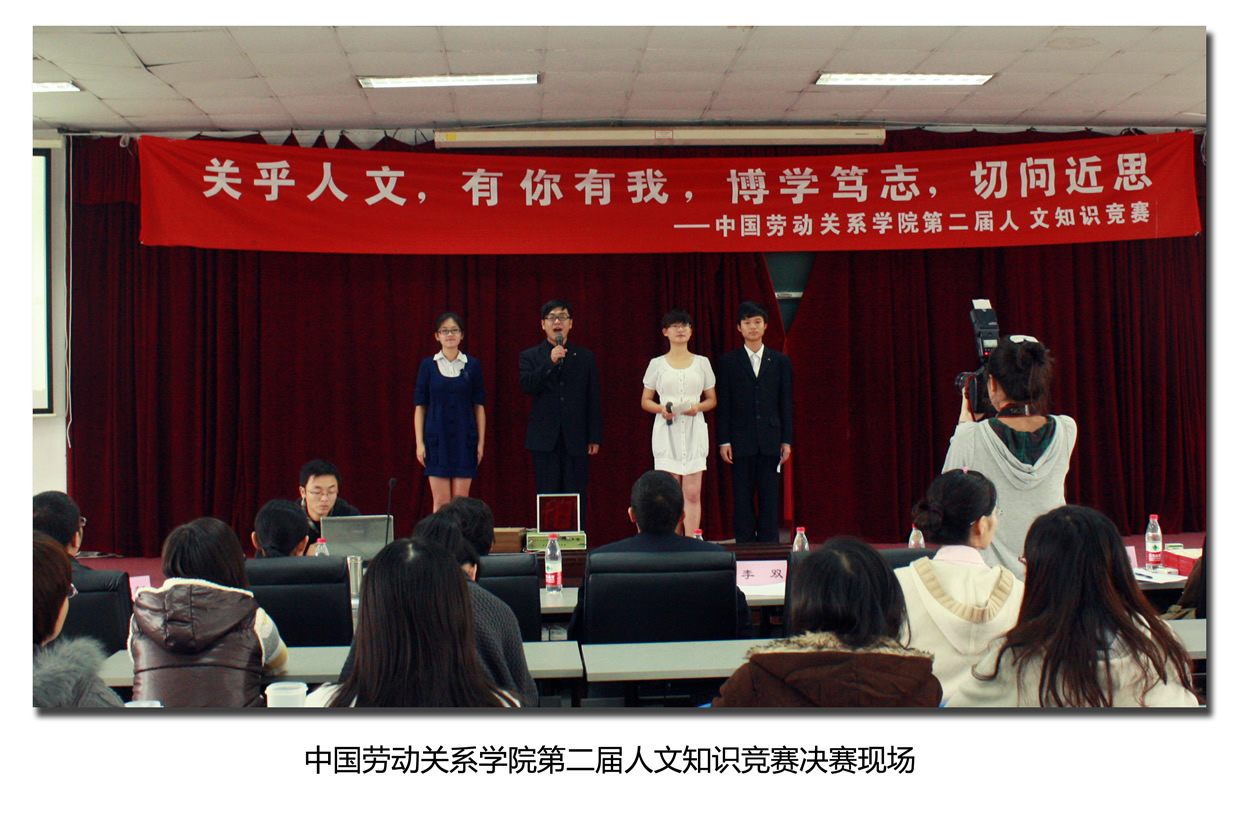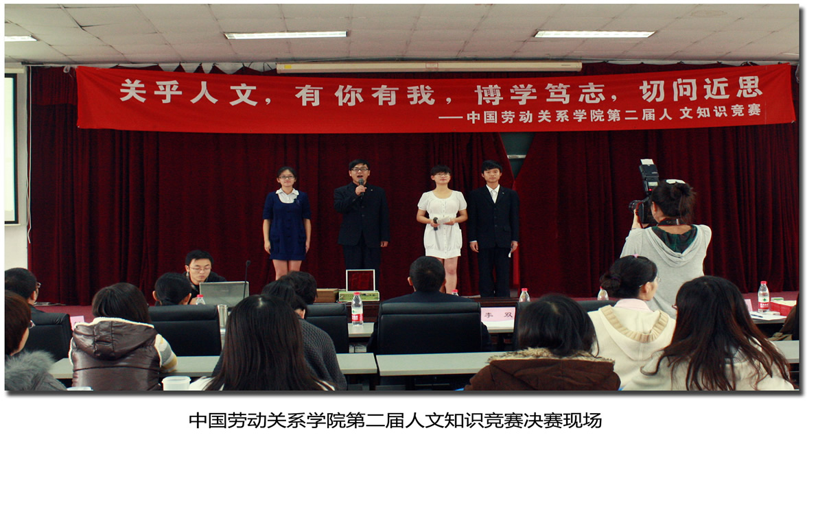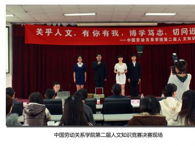 为了提高大学生的文化素养,培养大学生的文化自觉意识与创新精神,由中国劳动关系学院主办、文化传播学院承办的“博学笃志,切问近思”第二届人文知识竞赛自2010年10月中旬起在校本部顺利举行。10月23日,大赛复赛以及决赛在北京校区508教室隆重举行。学院教务处副处长李红卫、文传学院院长李双、文传学院副院长吕明涛等教师出席。