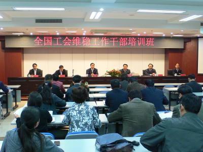 2012年4月8日至12日,全国工会维稳工作干部培训班在中国劳动关系学院举办。来自全国各省(市)、自治区、直辖市以及全总机关的70余人参加了学习。全总副主席、书记处书记陈豪、张鸣起,办公厅主任谷常生,副主任刘迎祥,全总组织部巡视员杨军日,学院院长李德齐等领导与学员合影留念。
