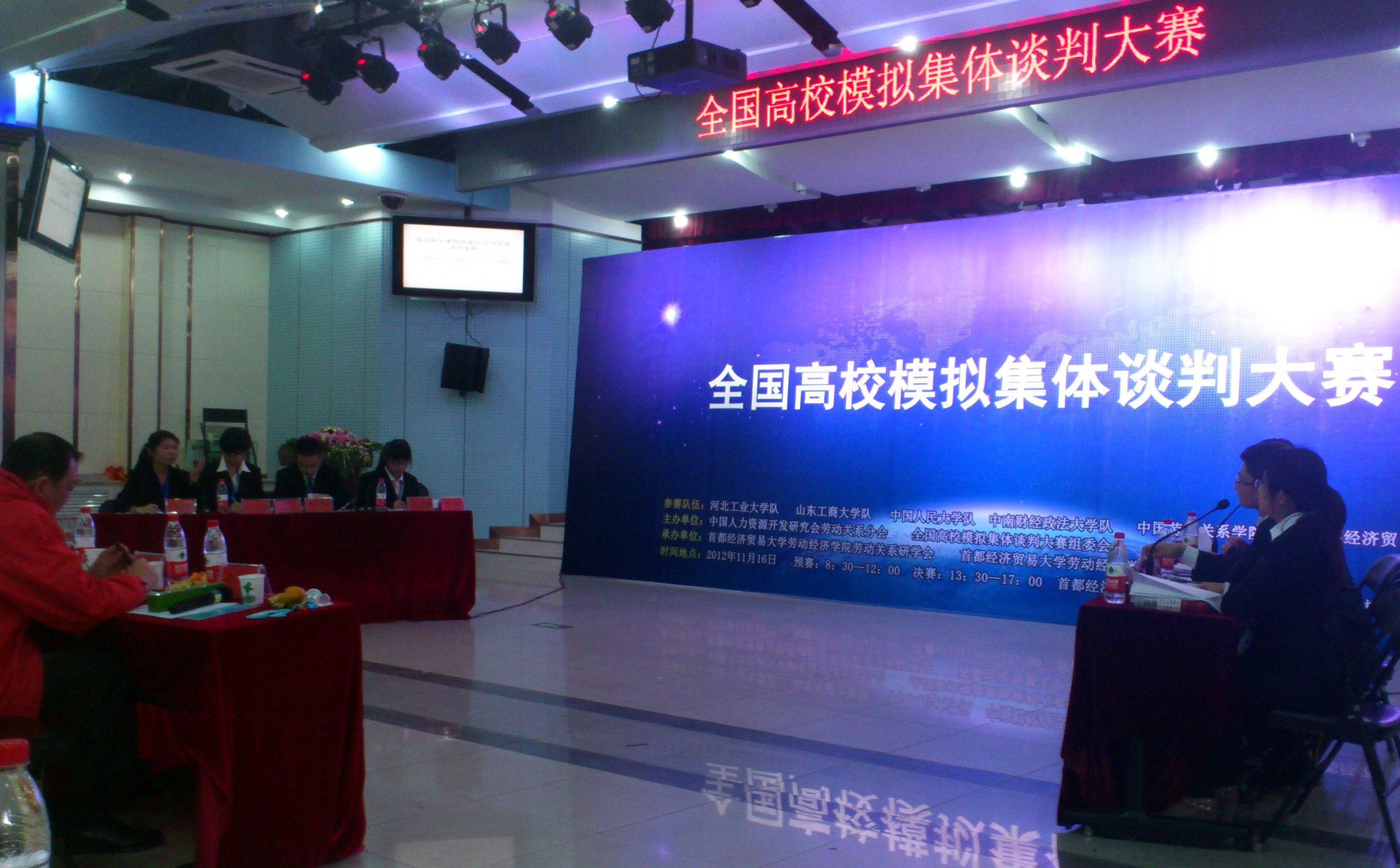 2012年11月16日,首届全国高校模拟集体谈判大赛在首都经济贸易大学劳动经济学院举行,参与大赛的有中国人民大学、首都经济贸易大学、中国劳动关系学院、中南财经大学、山东工商学院和河北工业大学六所院校,每所院校各派出劳资两支代表队参赛。我院劳动关系系派出由刘恬、王速超、卢清新、刘慧杰、杨雪琴组成的劳方代表队,由李康宁、黄劲旸、郑芳芳、简璐、汪丽组成的资方代表队。劳动关系系教师乔健、郑桥、王侃随队指导。