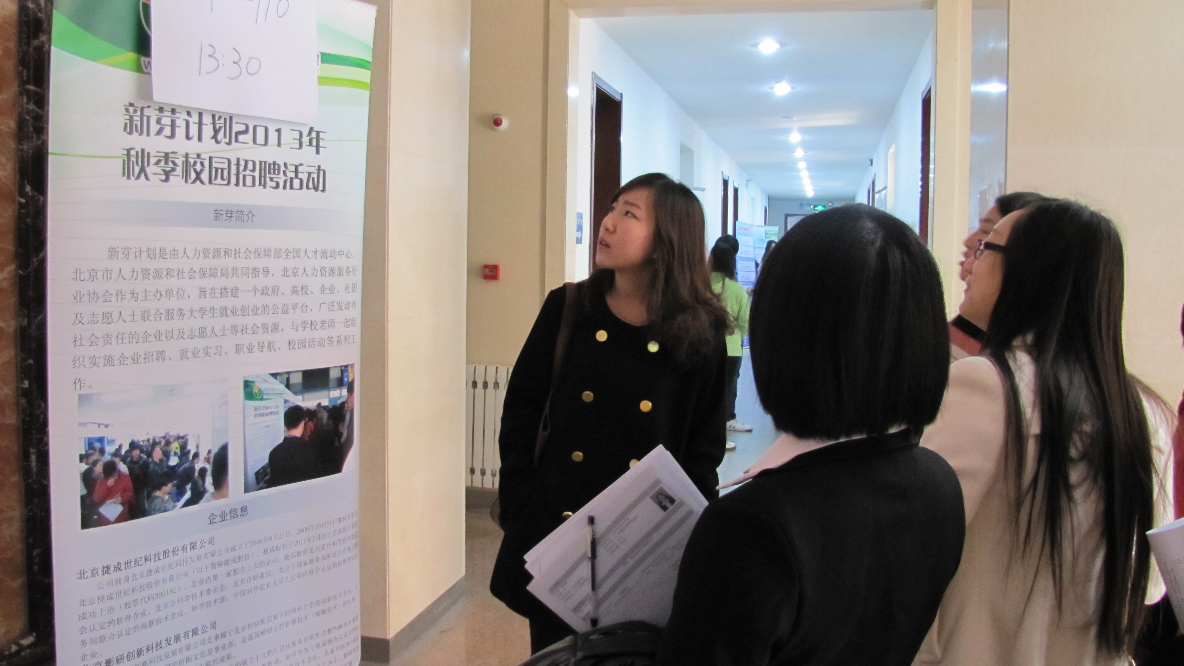 2013年11月8日,由学校就业指导中心和劳动关系系主办的“新芽计划”人力资源服务行业校园专场招聘会在校本部举行,北京市的10家人力资源服务企业走进我校招聘人才。