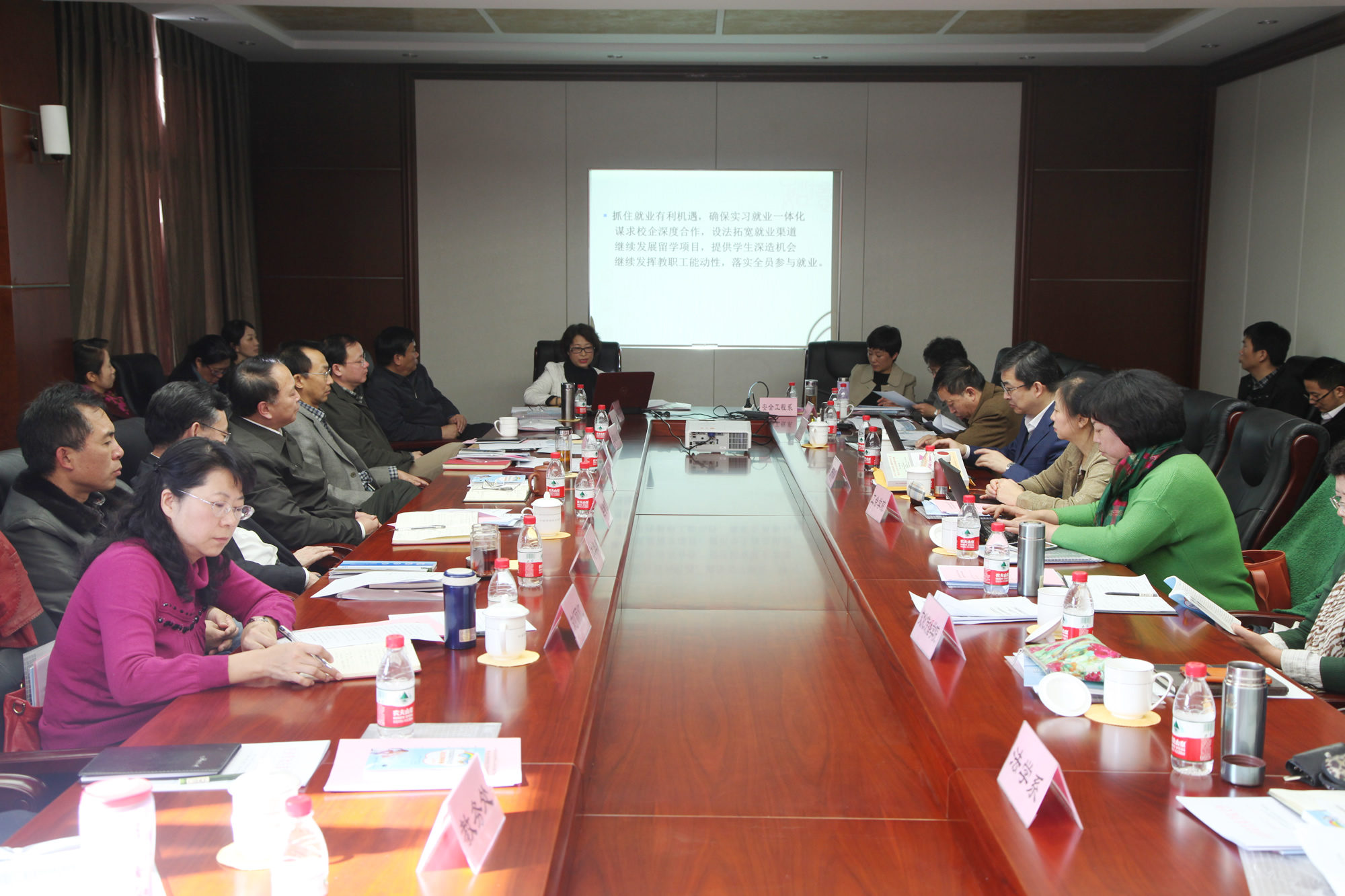学校就业指导中心汇报了2014届毕业生就业情况、工作开展情况和存在的问题、2015届毕业生基本情况及工作建议。各系(院)总支书记分别就本系(院)2014届毕业生就业情况和工作开展情况,以及2015届就业工作计划进行了汇报,此外,各系(院)主任还就国家就业宏观形势、特色人才培养、产学研一体化推进大学生就业等方面的问题进行了交流。