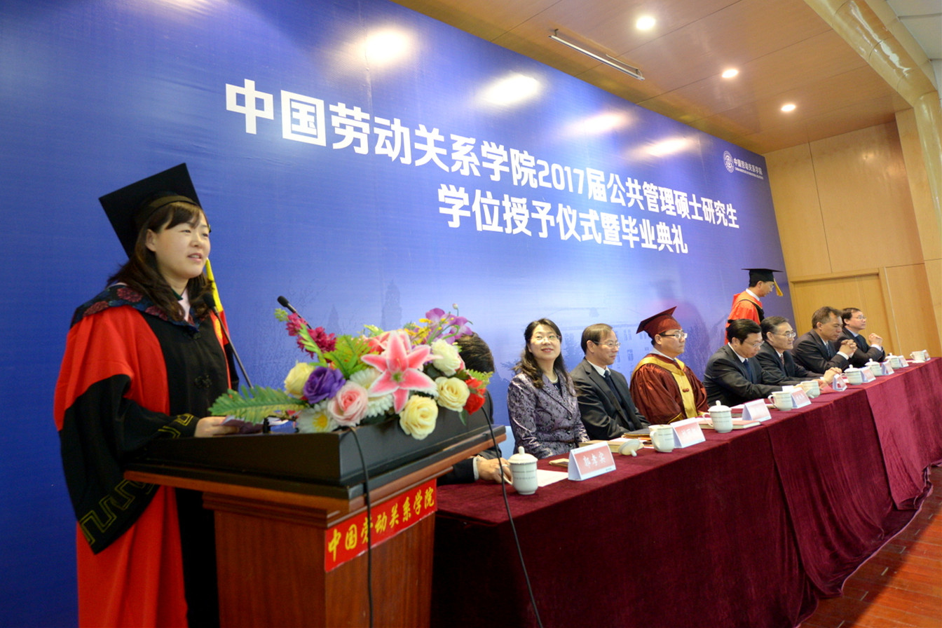 允文允武,前路几多高岗;一张一弛,此去一路扬帆。3月17日上午,北京校区508教室,35位2017届公共管理硕士研究生们与师长和亲友们欢聚一堂,盛装出席,喜气洋洋。我校第二届公共管理硕士研究生学位授予仪式暨毕业典礼隆重举行。中华全国总工会办公厅巡视员金善文副主任,学校领导屈增国、刘向兵、李华东、成国一、刘玉方、刘丽红、吴万雄、郭孝实出席典礼。2017届研究生毕业生、导师、副导师、研究生培养院(系)和相关职能部门负责人、教学秘书以及2016级研究生等100余人参加了毕业典礼。典礼由刘玉方副校长主持。